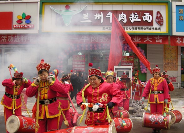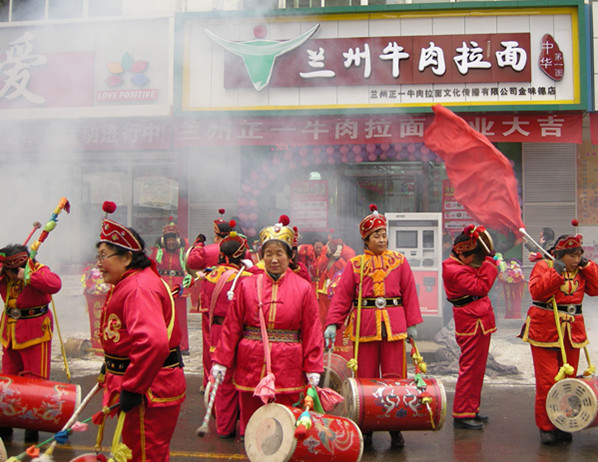 開業(yè)慶典現(xiàn)場可謂旌旗招展、氣勢恢宏、吸引了上百名觀眾前來參觀。祝賀“蘭州牛肉拉面”形象示范店金味德店開業(yè),并祝福蘭州牛肉拉面文化、事業(yè)發(fā)展得更大、更強,蒸蒸日上。