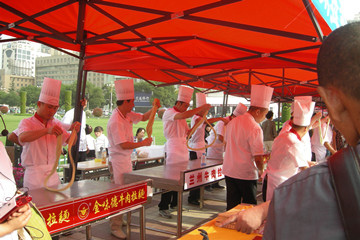 活動現場,公司下屬的分公司“蘭州牛肉面專業技術培訓中心”的學員,向廣大市民群眾展示了拉面的系列技術,包括溜條、拔劑子、拉面,其中拉面方面,表演了二細、三細、大寬、韭葉、蕎麥棱等,另外,學員還表演了公司主營產品蔬菜營養面,吸引了眾多觀眾圍觀、咨詢,場面火熱。同時,公司的蘭州牛肉拉面加盟連鎖,也備受關注,咨詢的人接連不斷。