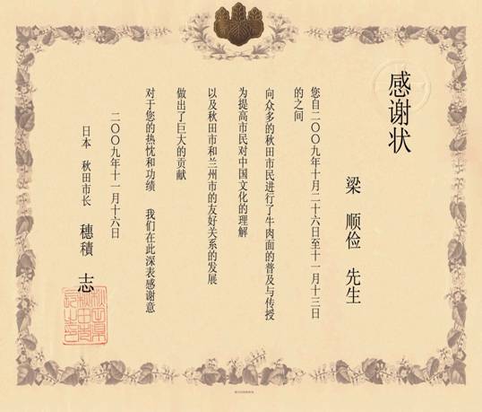 日本秋田市贈予金味餐飲有限公司總經理、蘭州市烹飪技術協會副會長梁順儉先生的感謝狀