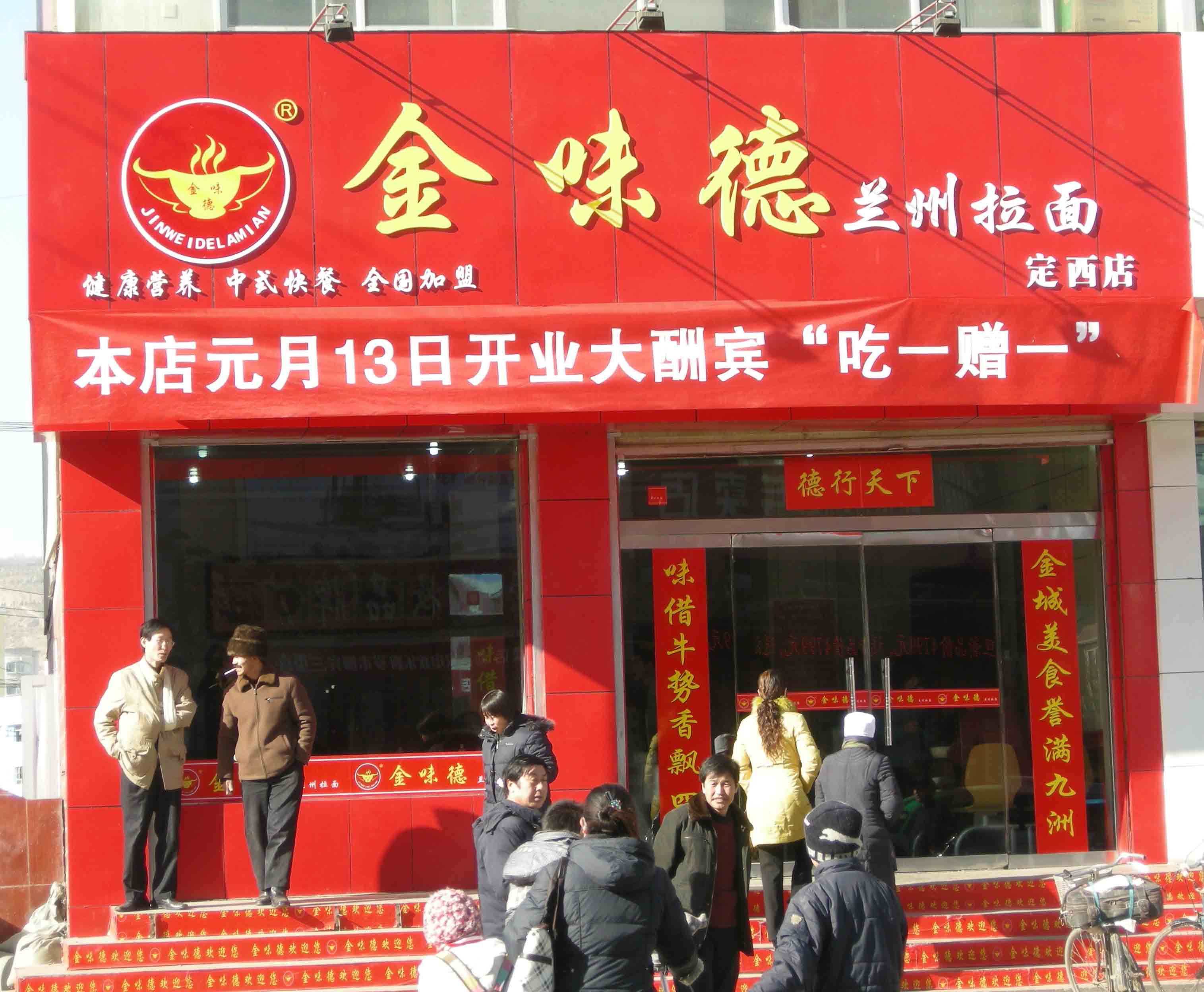 面面彩旗迎嘉客 爆竹聲聲道吉祥, 2010年1月13日,“金味德”蘭州拉面定西店隆重開業了!甘肅金味餐飲有限公司總經理梁順儉先生參加了開業典禮并就金味德拉面向大家做了詳細的介紹。金味德拉面不僅繼承了傳統蘭州拉面的特色,而且開發出了適合現代人營養要求的蔬菜營養拉面系列。其中包括綠色營養蔬菜拉面,南瓜營養蔬菜拉面等,現在已成為傳統蘭州拉面行當中的新秀,獲得顧客的一致認可和好評!