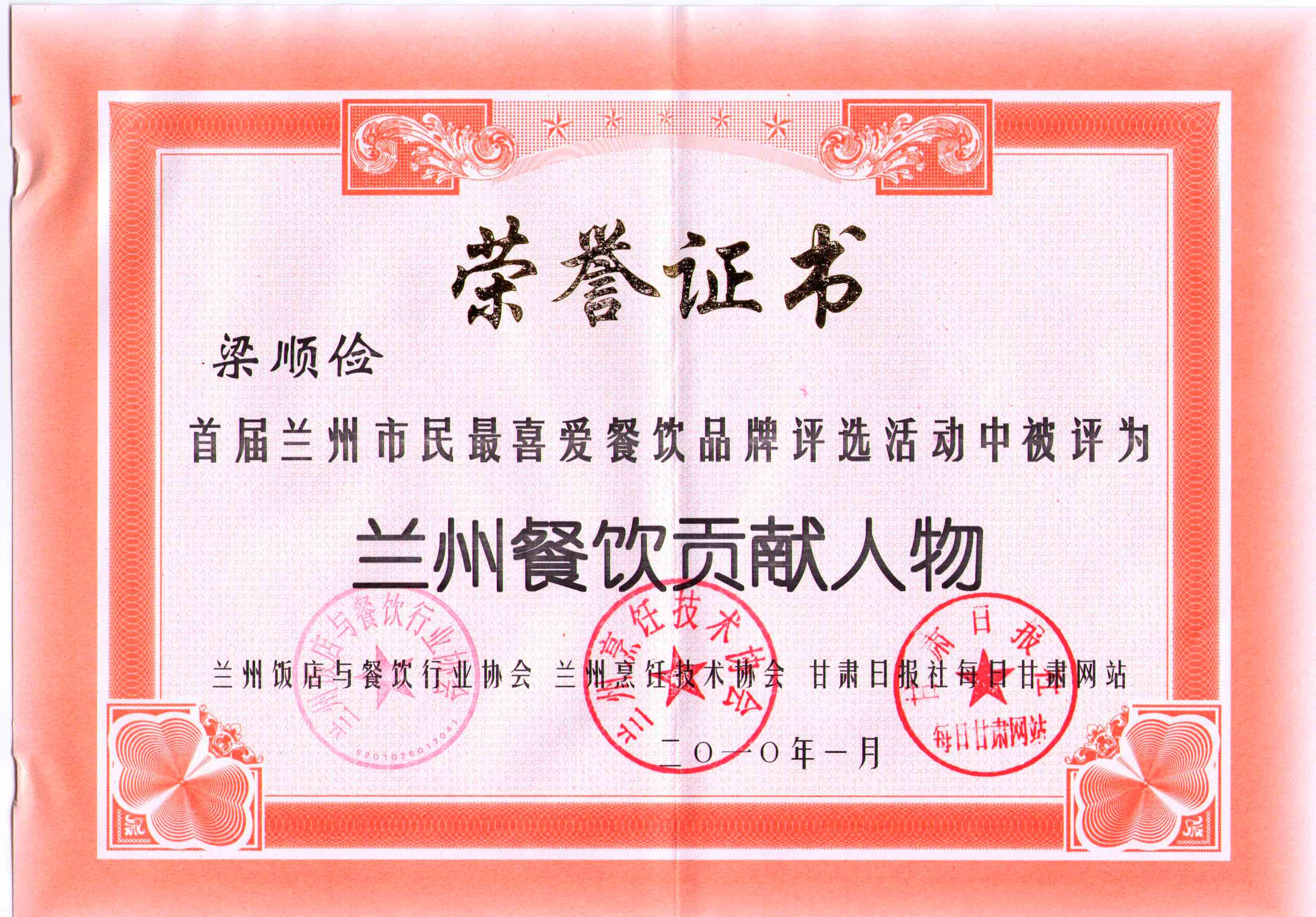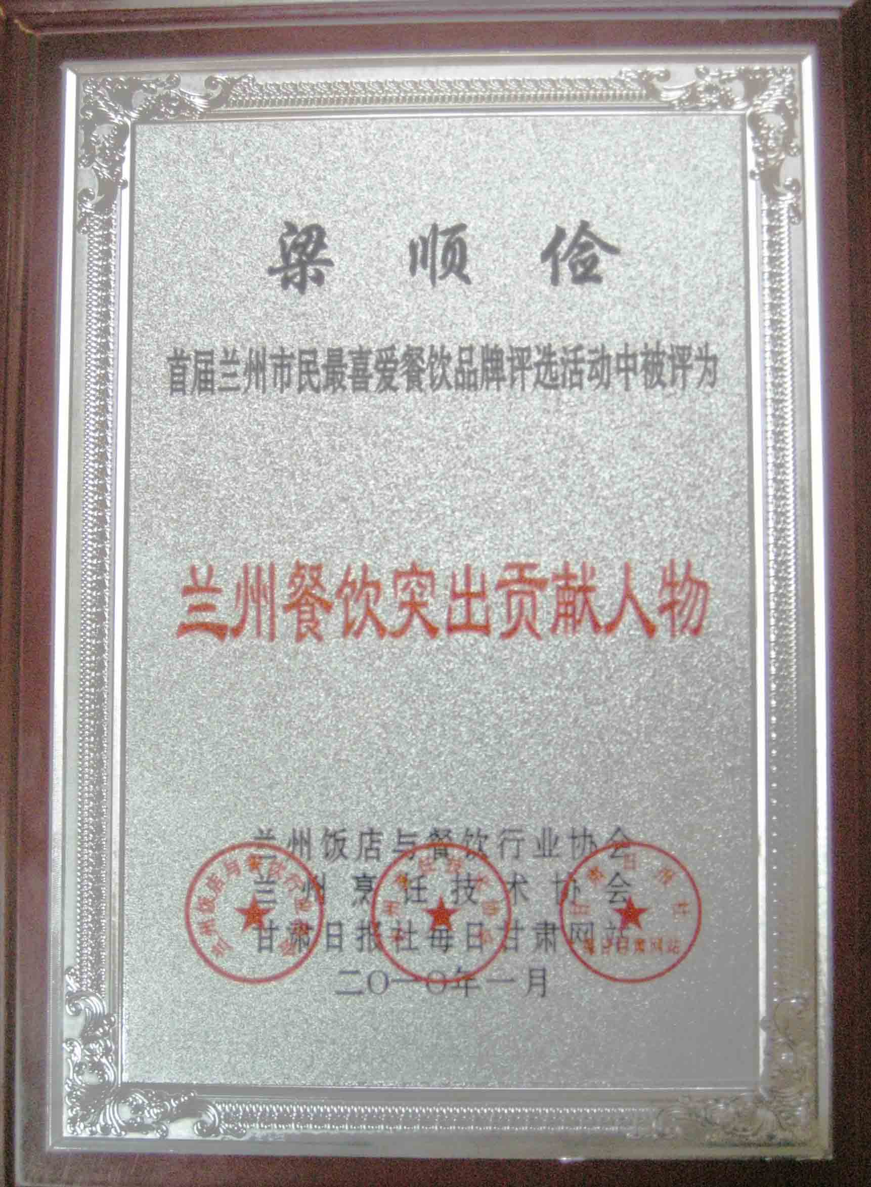 2010年1月28日,由蘭州飯店與餐飲行業協會、蘭州烹飪技術協會、甘肅日報社每日甘肅網聯合主辦的“首屆蘭州市民最喜愛餐飲品牌”評選系列活動圓滿落下帷幕。甘肅金味餐飲有限公司總經理梁順儉被評為了蘭州餐飲貢獻人物。對于梁順儉先生來說,這個獎項不同于以往的獎項,這是蘭州市民對梁順儉先生這些年來為了發揚蘭州傳統特色美食牛肉拉面所付出努力的最大肯定。梁順儉先生說,這是他二十多年廚藝生涯中最具有特殊意義的一個獎項,這個獎是廣大蘭州市民頒發給他的,有了廣大市民的支持,他會更有動力,更有激情投身于弘揚蘭州牛肉拉面的事業上,讓蘭州牛肉拉面香飄世界。