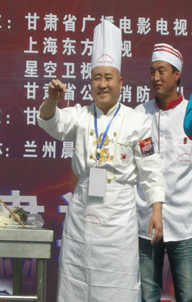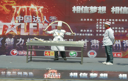 在9月29日《中國達人秀》蘭州第二場海選賽中,甘肅金味餐飲有限公司張興富師傅以牛肉拉面穿針的精彩表演絕對勝出!