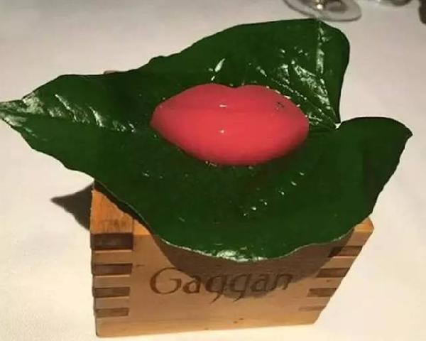 嘴唇emoji是一盤嘴唇形狀的菜,一顆用柚子和荔枝做的嘴唇形果凍,躺在一張檳榔葉上,菜名叫“吻我”。