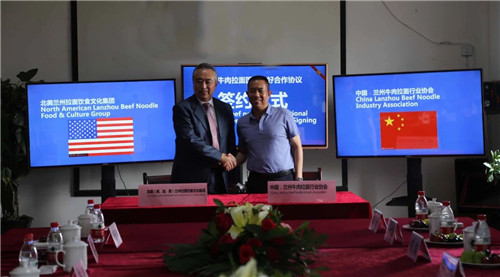 美國南加州華人華僑商會會長、北美蘭州拉面餐飲文化集團董事長應持榮同蘭州牛肉拉面協會會長馬利民簽訂戰略合作協議。