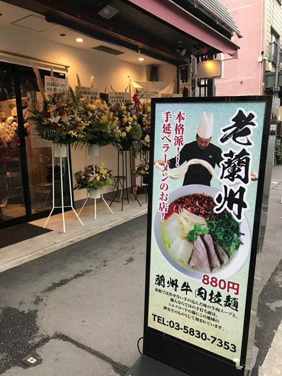 在日本的東京,約在兩年前開始出現了兩家經營蘭州牛肉拉面的店鋪,但這兩家店鋪的經營者并非地道的蘭州人,這使土生土長的在日本生活的甘肅同鄉會的會員們感到了不小的慚愧與壓力,在甘肅同鄉會名譽會長王昕的唱導下,會員們一致贊成,在東京開一家蘭州人自己經營的蘭州牛肉面店,此想法得到了甘肅省僑聯領導及蘭州牛肉面聯合會的大力支持,同鄉會會員多次返回蘭州取經問寶,經過一年間的緊張籌備,9月2日首家由蘭州人自己經營的蘭州牛肉拉面店終于在東京淺草成功開張!