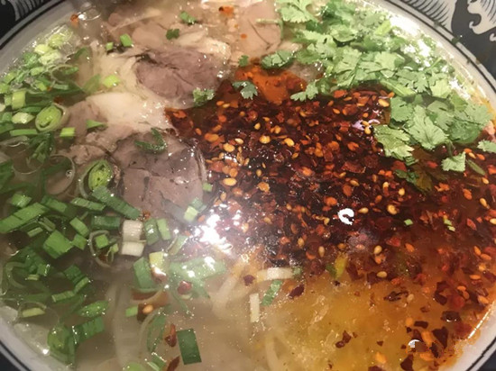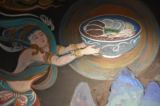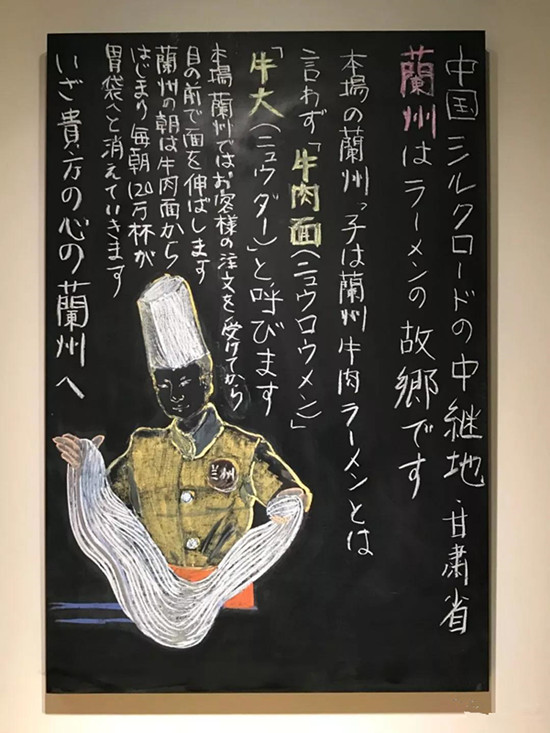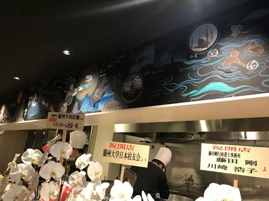 據“老蘭州”蘭州牛肉面店長楊勇奇先生介紹,“老蘭州”牛肉面店開張,最初的想法是為了圓在日本從小吃牛肉面長大的蘭州人的一個夢想,為在日華人及日本客人提供正宗的蘭州牛肉面,所有面條都是由店內的師傅手工拉成,比如在菜單上有款叫“肉蛋雙飛”的牛肉面,這款牛肉面不是在蘭州生活過的人基本上不會知道。經營模式上不釆用純商業運作,而是將老味道、古文化、純鄉情融入到每一碗牛肉面中,讓在日本的蘭州人感覺到家的味道,并邀請在日華人敦煌研究家張源之老師用了一個多星期的時間,將甘肅從敦煌到天水間的名勝,用八米長的壁畫形式展示在店內的墻壁上,讓來店的每一位體驗到敦煌文化的博大精深。