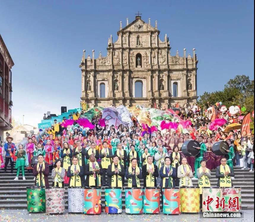 資料圖:2019年12月8日下午,由澳門特區政府文化局主辦的 “2019澳門國際幻彩大巡游”在著名景點大三巴牌坊前掀開序幕,來自“一帶一路”沿線國家及地區80隊巡游表演隊伍參與演出,共慶澳門回歸祖國20周年。中新社記者 鐘欣 攝