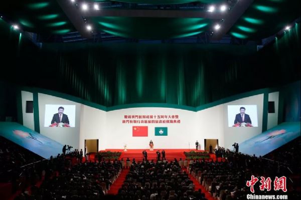 資料圖:2014年12月20日,中共中央總書記、國家主席、中央軍委主席習近平出席慶祝澳門回歸祖國15周年大會暨澳門特別行政區第四屆政府就職典禮并發表講話。中新社發 盛佳鵬 攝