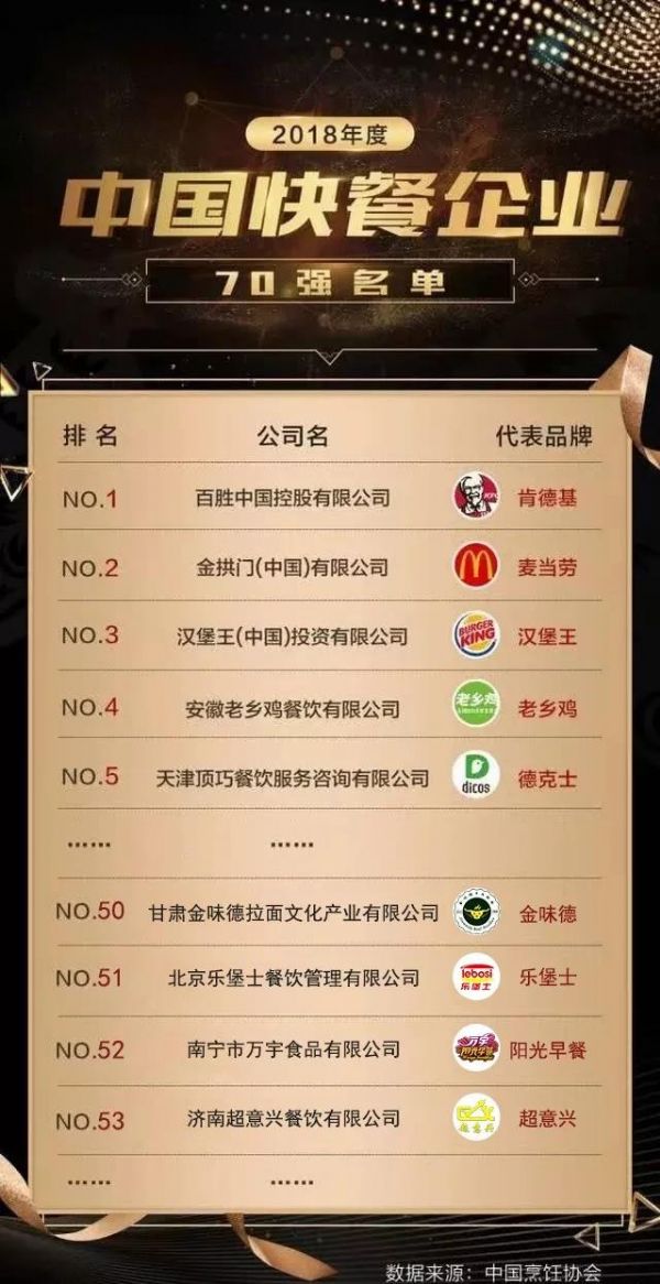 10月11日,中國快餐產業大會于大連召開,中國烹飪協會在會上頒布了“2018年度中國快餐70強榜單”。這個榜單的Top 3是再熟悉不過的面孔:肯德基(百勝中國,旗下還有必勝客等)、麥當勞(金拱門)、漢堡王。