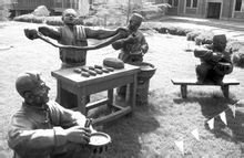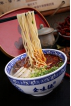 將溜好的面條放在案板上,撒上清油(以防止面條粘連),然后隨食客的愛好,拉出大小粗細不同的面條,喜食圓面條的,可以選擇粗、二細、三細、細、毛細5種款式;喜食扁面的,可以選擇大寬、寬、韭葉3種款式;想吃出個棱角分明的,拉面師傅會為你拉一碗特別的"蕎麥楞"。拉面是一手絕活,手握兩端,兩臂均勻用力加速向外抻拉,然后兩頭對折,兩頭同時放在一只手的指縫內(一般用左手),另一只手的中指朝下勾住另一端,手心上翻,使面條形成絞索狀,同時兩手往兩邊抻拉。面條拉長后,再把右手勾住的一端套在左手指上,右手繼續勾住另一端抻拉。抻拉時速度要快,用力要均勻,如此反復,每次對折稱為一扣。