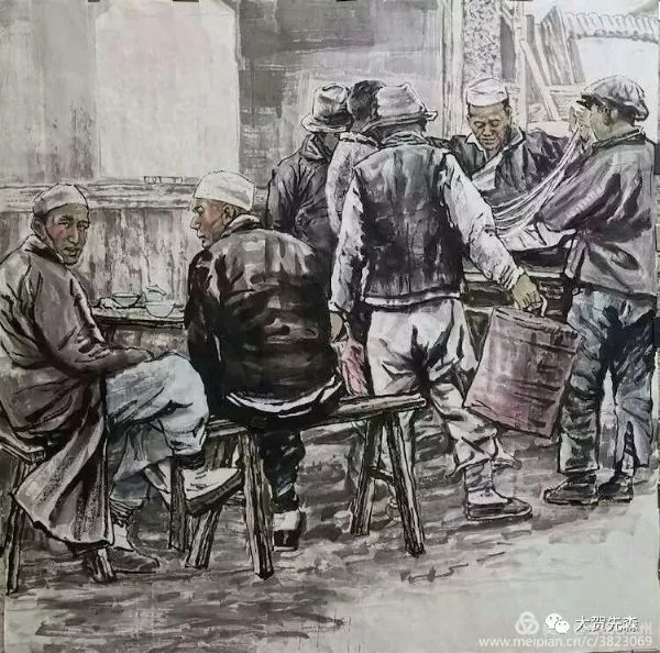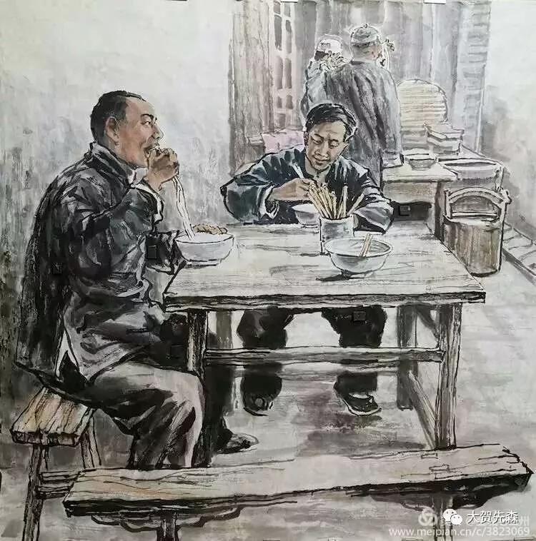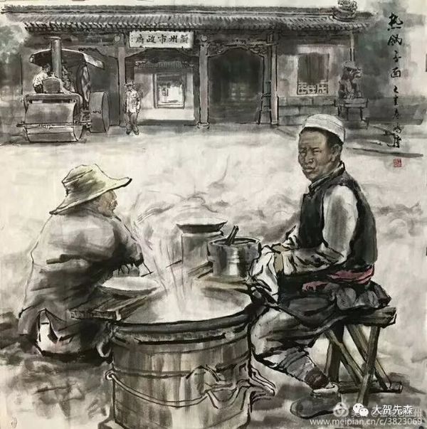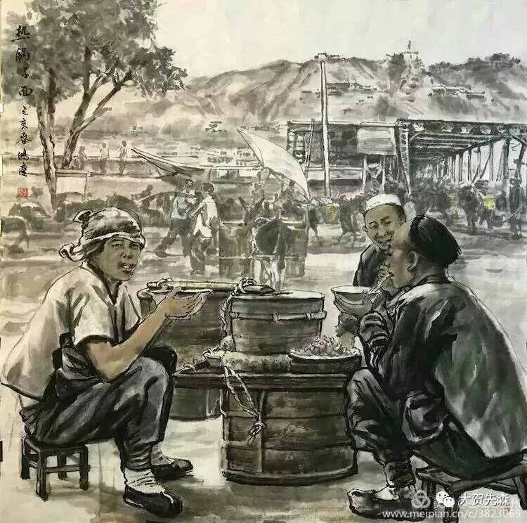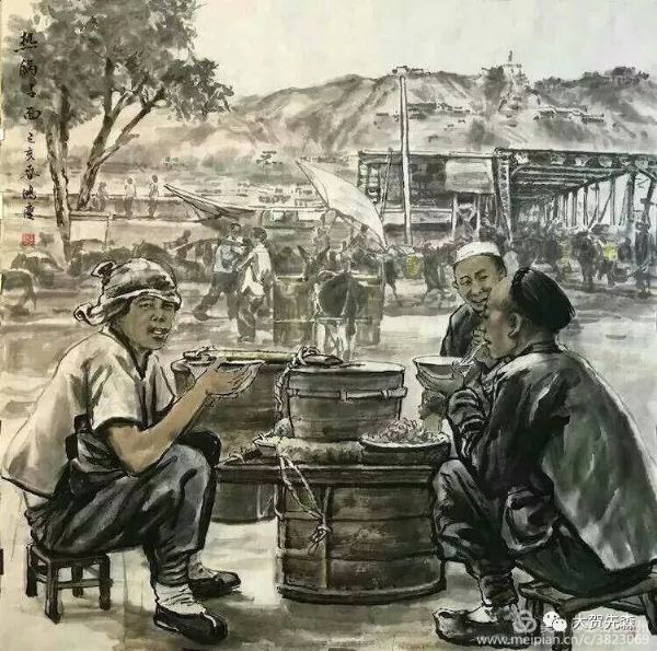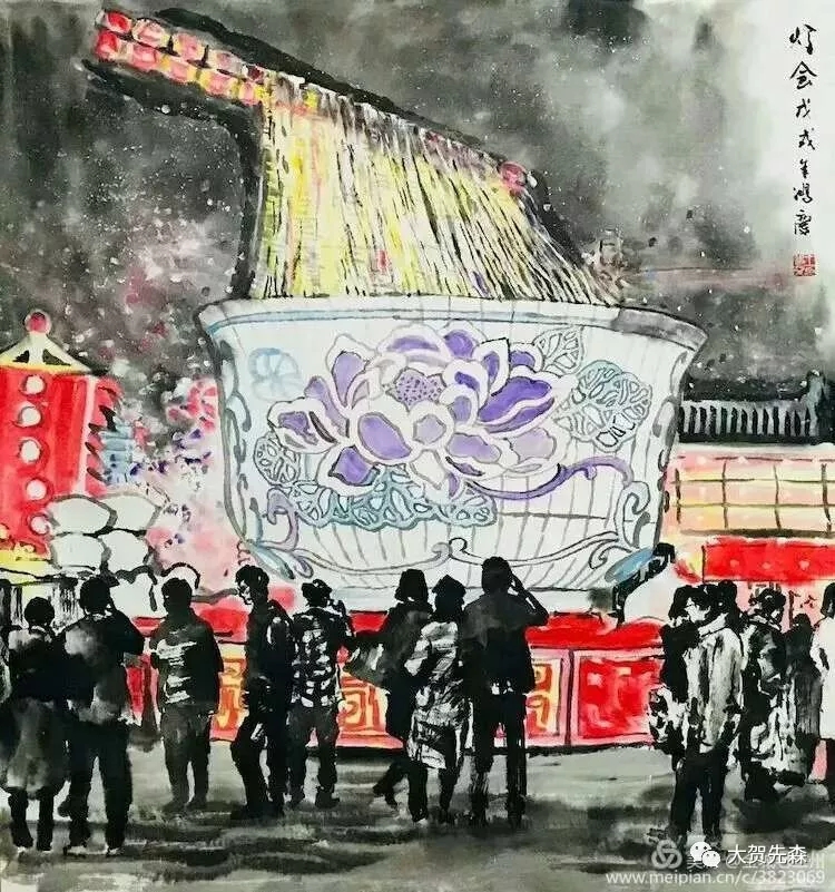 元宵節(jié)的燈會上,蘭州的牛肉拉面牛氣沖云霄 ! 《 燈會 》這副畫作是王鴻慶老師為中國國際廣播電臺2018年元宵頌詞中選用的老蘭州國畫作品而專門創(chuàng)作的。作品中駐足觀賞燈會的人物全部用飛墨留白的筆法,非常好地對比渲染出絢麗繽紛的燈光幻影, 一個極大夸張的海碗造型將碗中的牛肉面高高揚在半空中,淋漓盡致地把蘭州牛肉面的市場牛氣淋漓盡致地表現(xiàn)了出來,讓每個蘭州人看了都會歡欣鼓舞,無比自豪!