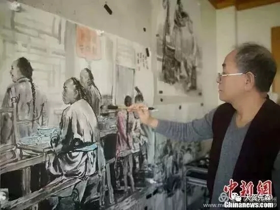 圖為王鴻慶老師在創作《牛肉面》系列國畫作品。