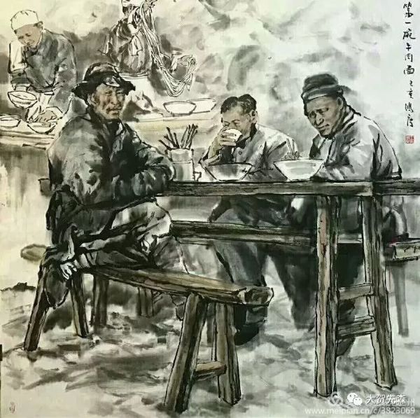 王鴻慶老師《牛肉面》系列畫作,牛肉面館里的食客們埋頭吃面大口喝湯的專注神情……吃牛肉面時,牛肉片香軟有味,面條非常筋道,一口一口地吃下去有點欲罷不能的感覺,怪不得很多食客吃起來連頭都不抬呢。