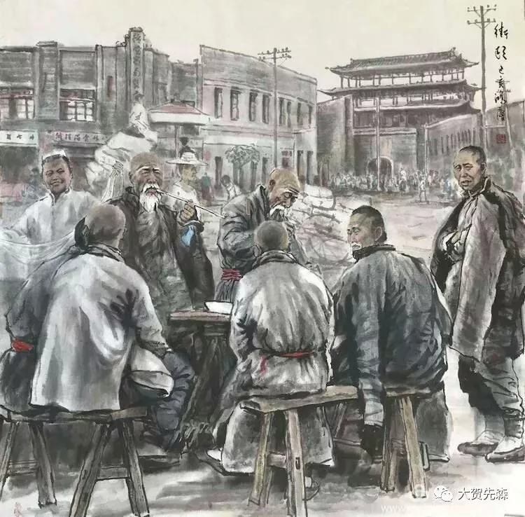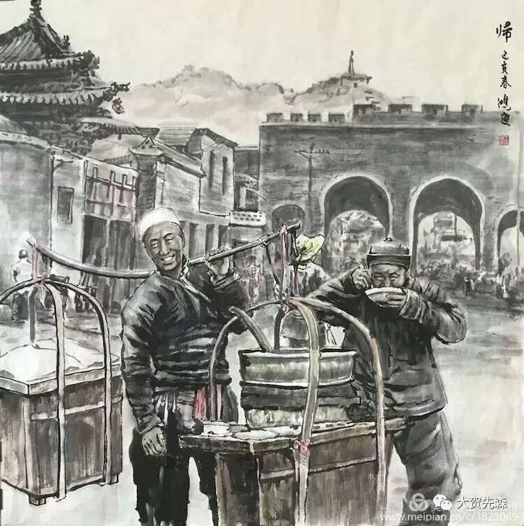王鴻慶老師《牛肉面》系列畫作《歸》,馬保子挑著擔子沿街叫賣自己首創的熱鍋子面,已經到了該收攤回家的時候了,還有路上的食客站著狼吞虎咽地吃著熱鍋子面……