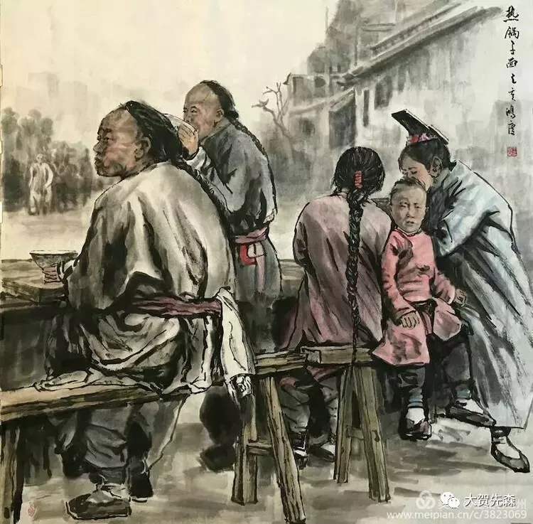 王鴻慶老師《牛肉面》系列畫作《熱鍋子面》,作品描繪了熱鍋子面在街頭熱賣的一個場景,大大咧咧的男食客們有的站起來大口喝湯,有的鼓著腮幫子拼命嚼面,女食客們都正襟危坐地坐著埋頭吃面,還有穿著旗人服裝的旗人婦女帶著孩子一起吃面……