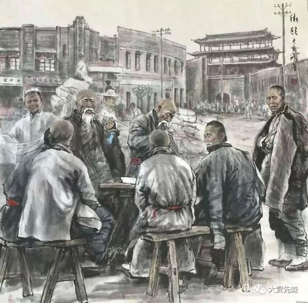 王鴻慶老師《老蘭州》系列畫作《街頭》,描繪了熱鍋子面在街頭熱賣的場景,戴著白帽子的拉面師傅在賣力地做著拉面操,食客們有的站著,有的坐著,一位長胡子的回族大爺吃完一碗牛大,正心滿意足地拿起煙斗抽起來……