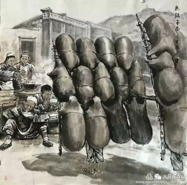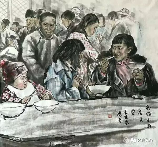王鴻慶老師《老蘭州》系列畫作《熱鍋子面》,從黃河浪尖剛剛歸來的筏子客,渾身濕透的衣服都顧不上換,就地一碗熱氣騰騰的熱鍋子面,解乏解餓,面湯里放幾勺辣椒面,辣得渾身冒汗,身上的潮氣一掃而光……