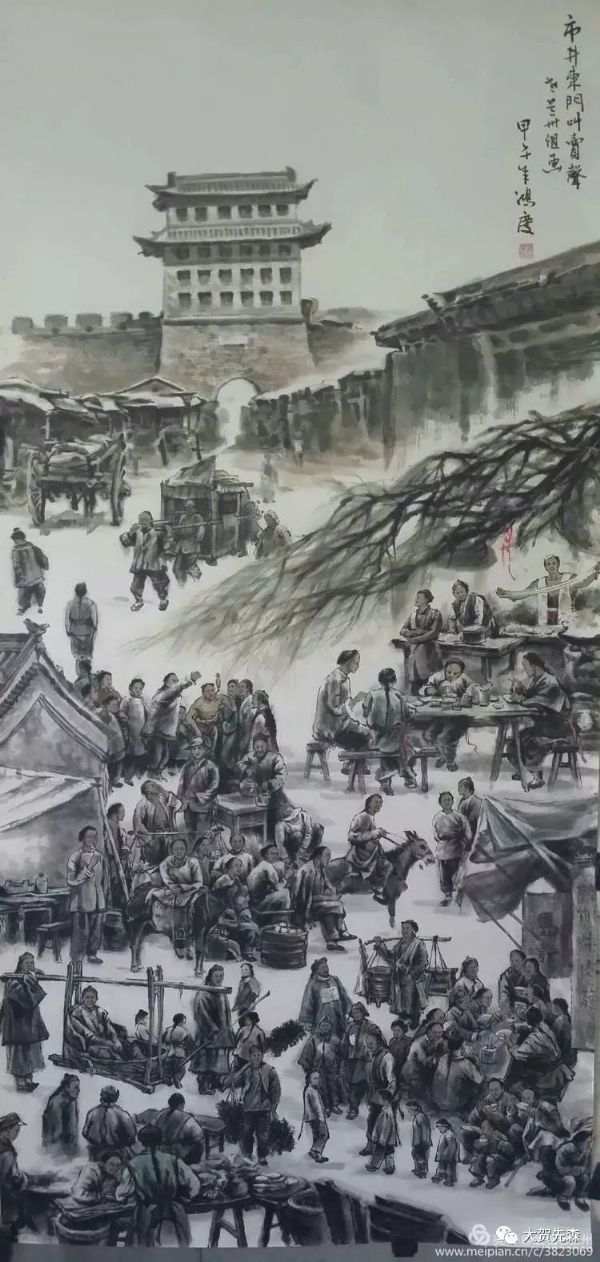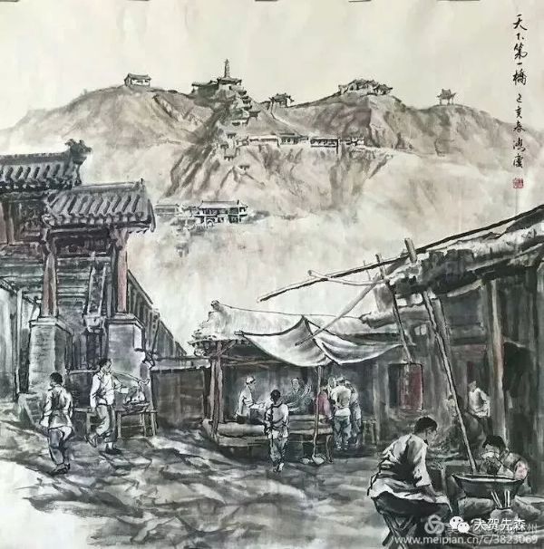 王鴻慶老師的《老蘭州》系列畫作《市井東門叫賣聲》,這副八尺巨作精心刻畫了一百多個栩栩如生、不相雷同的人物形象,再現了明末清初老蘭州昔日市場的繁華景象,在這副作品中,依然能看到戴白帽子的回族拉面師傅熟悉的表演拉面絕技的身影,碩大的《馬記牛肉面》的招牌依然醒目,作品用了近三分之二的空間重現了當年牛肉面館熱鬧非凡的場景。