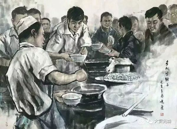 牛肉面館里人頭攢動,遠遠就聞著熟悉的牛肉面的清香味,人們排著長長的隊伍就是為了吃一碗正宗的牛肉面,油潑辣子的鮮香讓人過癮,王鴻慶老師《牛肉面》系列畫作《多加些辣子》。