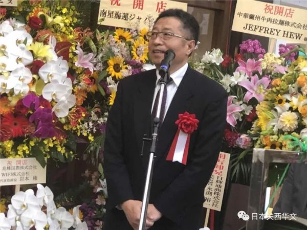 日本友好人士、日中經貿中心常務理事池田稔也在現場發言。他先介紹了日本拉面的歷史,同時表示:“在中國,面的歷史非常悠久,各類繁多,其中蘭州拉面是最有名的面,在中國在哪里都能吃到的老百姓喜歡的面之一。”他說:“在中國最有名的蘭州拉面來到神戶了,在神戶跟世界上最有名的神戶牛肉匯合,成為蘭州牛肉拉面了。這拉面是在中國、在日本或者在全世界的哪里都不能品嘗的,世界第一的蘭州神戶牛肉拉面�!背靥锵壬瑫r表示:日本的很多文化習慣是從中國學過來的,現在日本和中國之間有多方面的合作�!爸孕南M@蘭州牛肉拉面作為中國和日本的飲食文化合作的結晶,成為很多人喜歡的,許多人吃的神戶名菜�!绷硪晃恢匾钨e、中國駐大阪總領館商務室負責人孫淑強也發表了講話,對神戶蘭州拉面店開業表示熱烈祝賀。