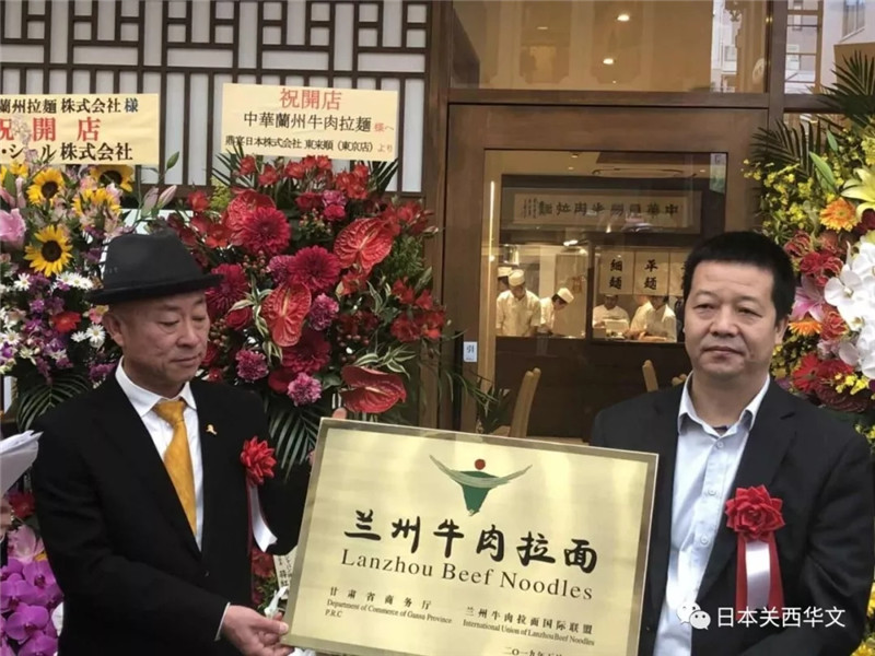 在致辭結束后,當天到場的嘉賓為神戶“中華蘭州牛肉拉面”店舉辦了隆重的剪彩儀式;甘肅省商務廳特派專員、蘭州牛肉拉面國際聯盟主席梁順儉也向中華蘭州拉面株式會社社長康主恩授予了“蘭州牛肉拉面”的認定牌匾。專程邀請前來表演的舞獅隊舉行了開業雄獅表演,康主恩社長專門進行了雄獅點睛儀式。