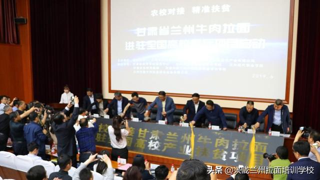 6月6日,由教育部發起和督辦的“農校對接、精準扶貧蘭州牛肉拉面進駐全國高校窗口項目”在蘭州大學舉行了啟動簽約儀式。甘肅省政府副省長張世珍、蘭州大學黨委書記袁占亭出席見證,教育部學校規劃建設發展中心項目負責人王睛、省政府副秘書長賈寧、省商務廳副廳長任福康、省教育廳副廳長趙凱、省人力源和社會保障廳副巡視員劉效明、省政協社會和法制委員會副主任沈興國、蘭州市人民政府副市長馬彩云、甘南藏族自治州政府州副州長候曉峰和甘肅省烹飪協會、蘭州牛肉拉面行業協會、蘭州資源環境技術學院、蘭州現代職業學院、甘肅興隴蘭州牛肉拉面職業學院負責人參加啟動儀式。