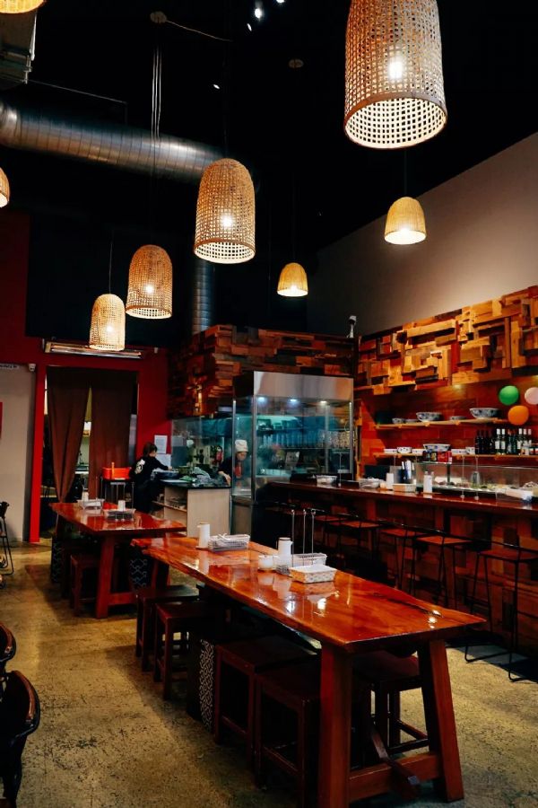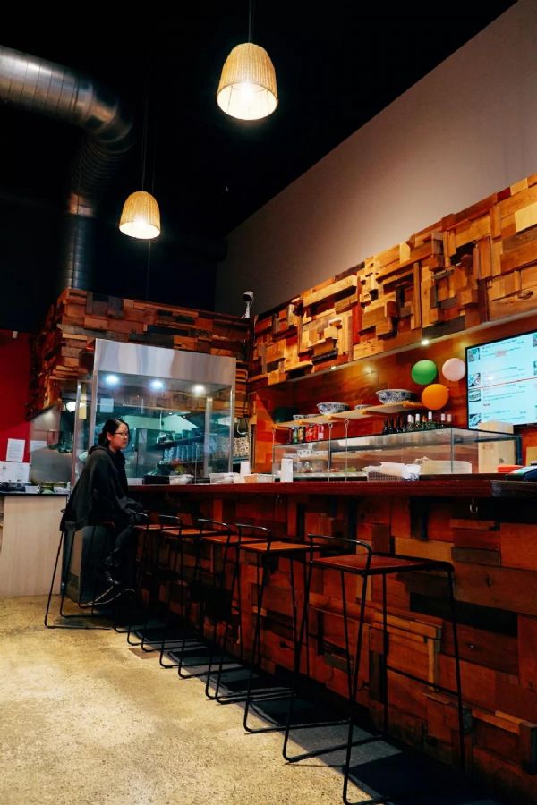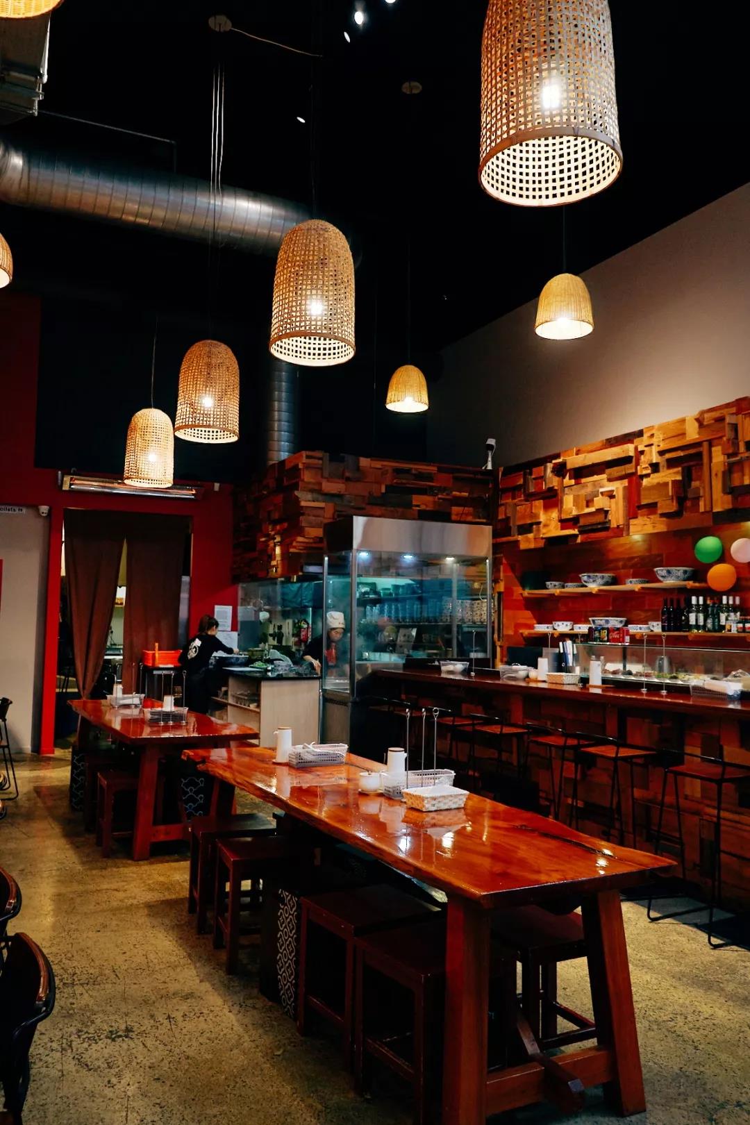 進到店里,傳統與現代相結合的裝潢風格令人賞心悅目。木質桌椅、皮革沙發,簡潔大氣;竹制燈籠營造出搖曳曼妙的氛圍;巨幅海報詮釋著拉面之道。