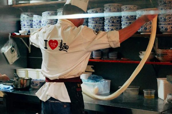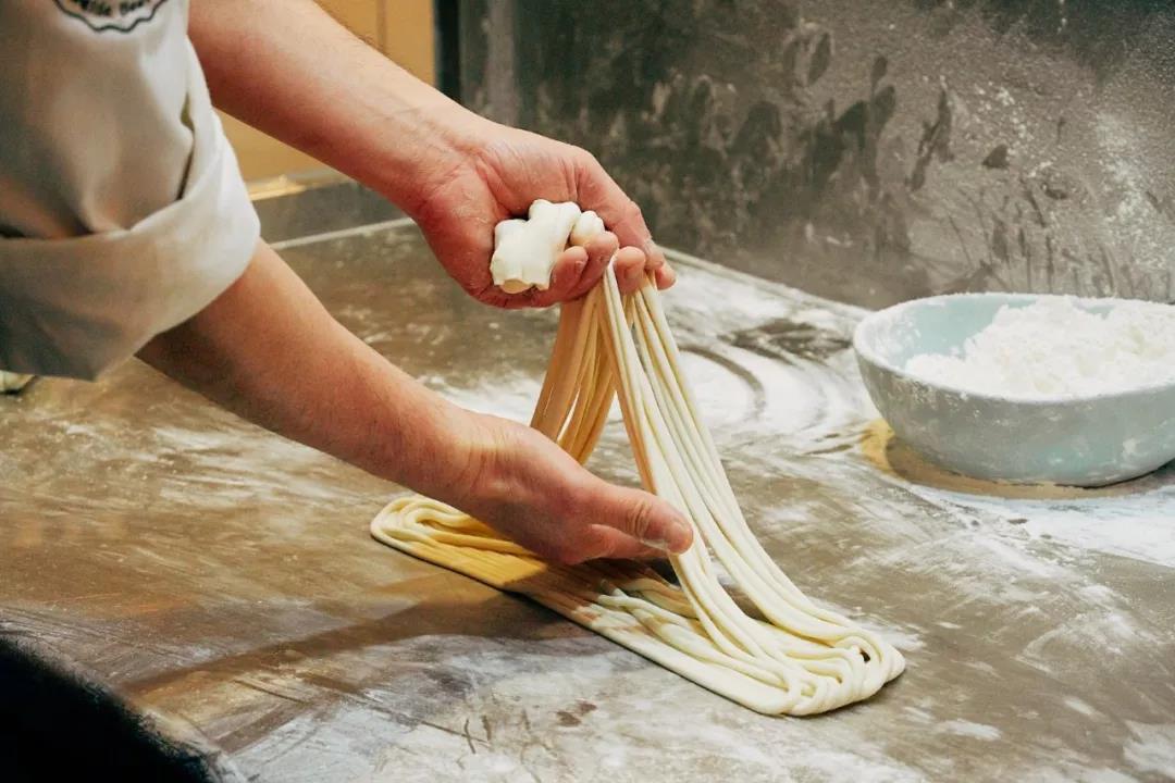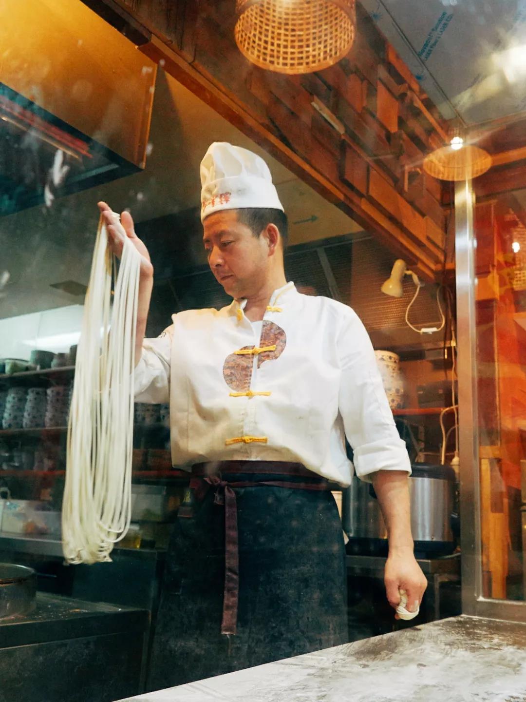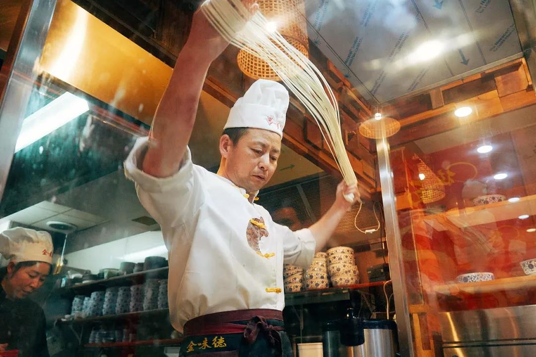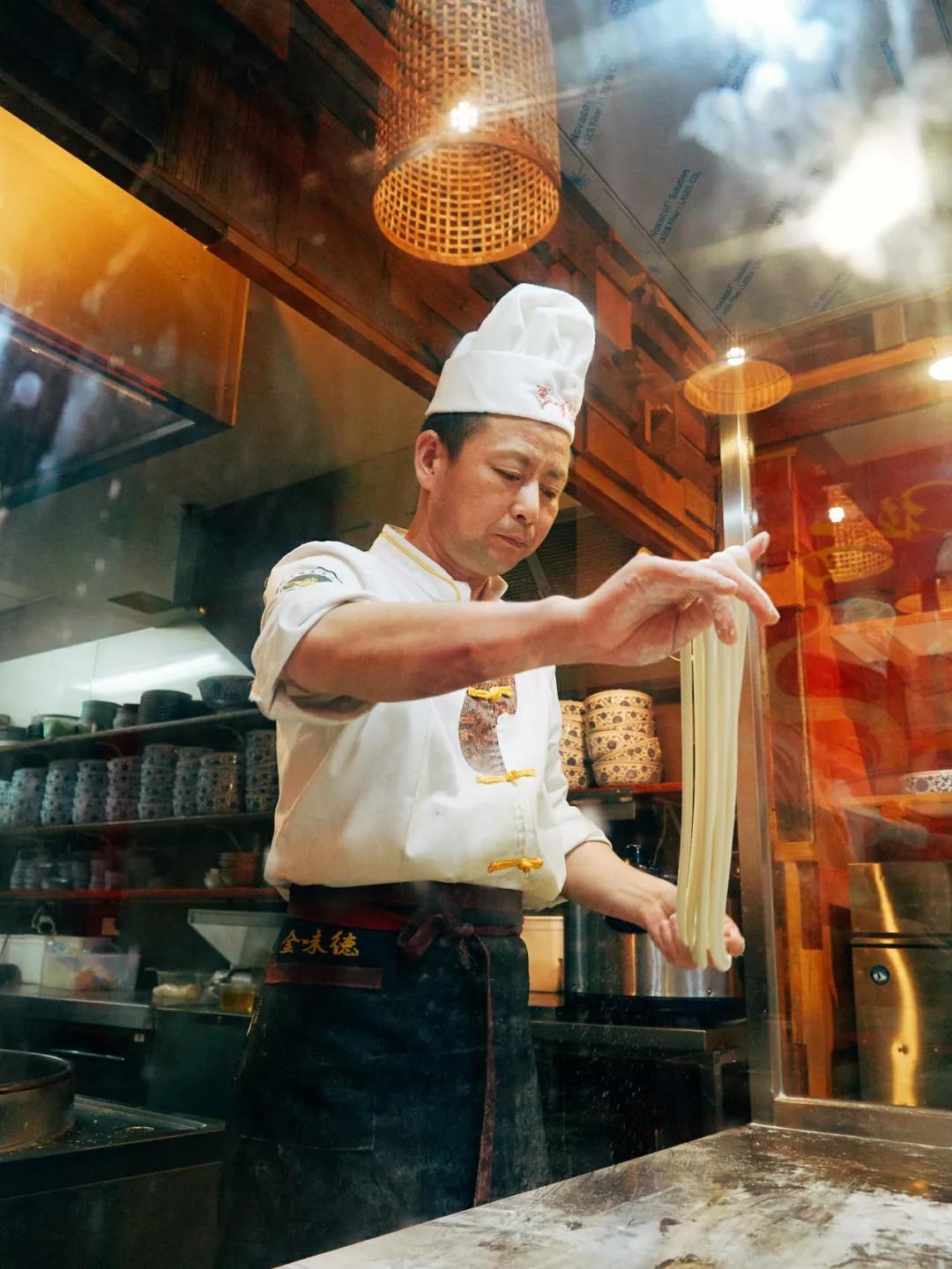 金味德的拉面師傅宛如一位身懷絕技的武林高手,站在開放廚房后面,一塊面團經過搗、揉、抻、拉、摔、摜等手法,只消片刻功夫,變得柔韌綿長、粗細均勻,讓人嘖嘖稱贊!