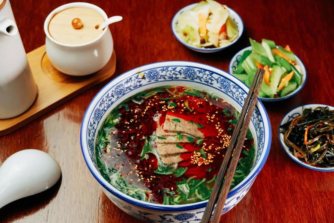 面熟撈起,灑上蔥花香菜,澆上獨家熬制的高湯,進一步釋放香氣,淋上紅油辣子點綴,加入牛肉,一碗拉面大功告成!