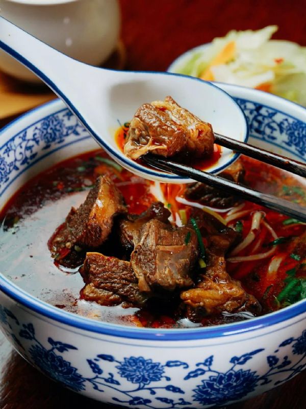 用筷子挑起一簇面條,柔滑透黃,大片牛肉蓋在面上,鮮嫩軟爛。