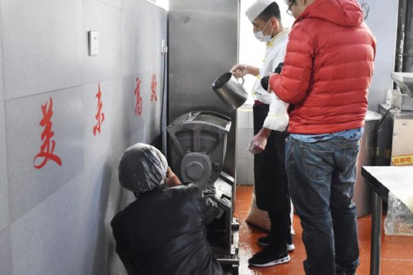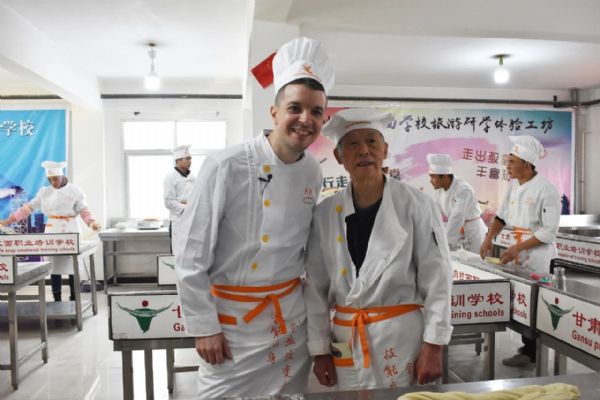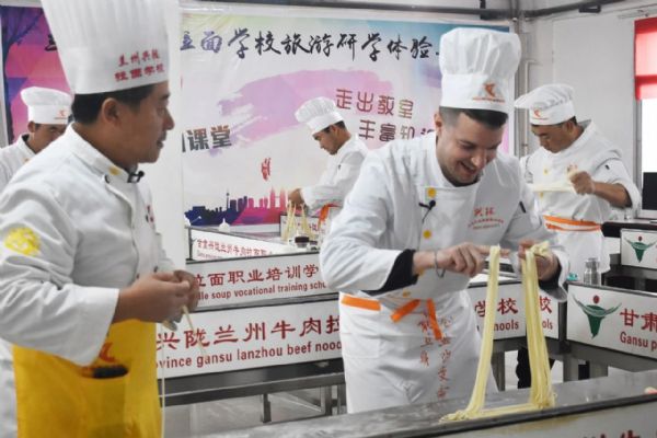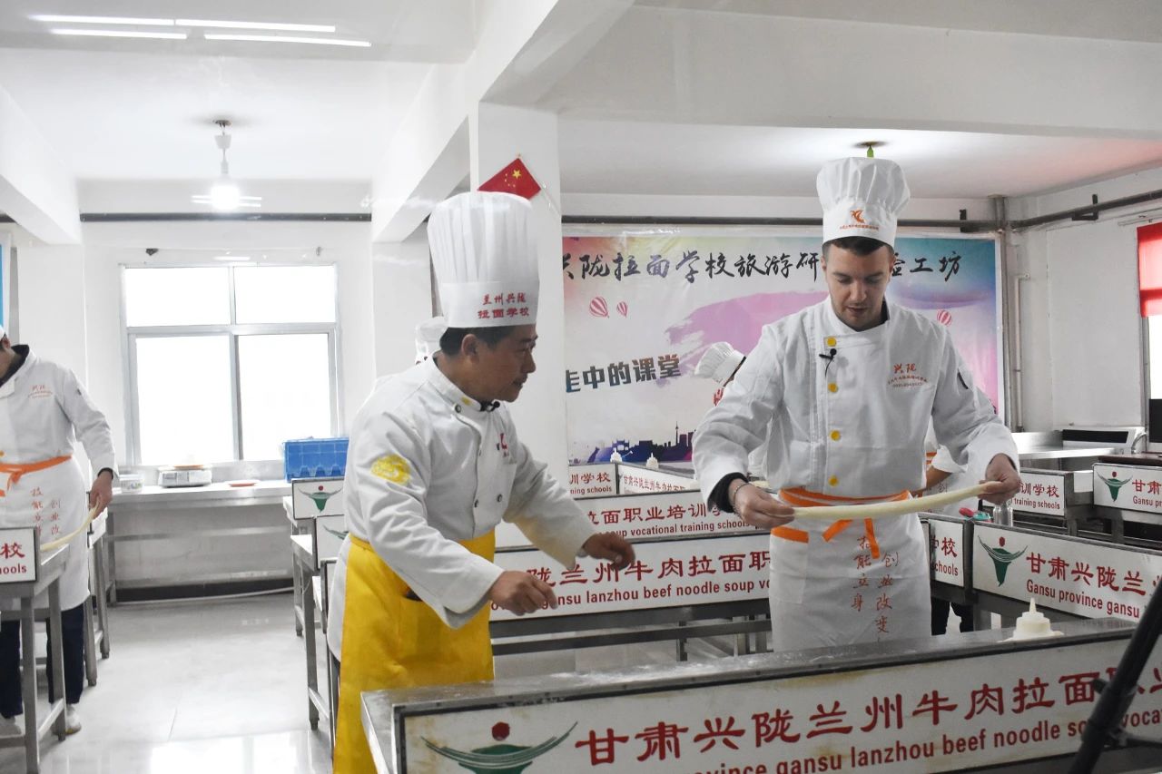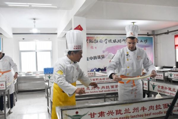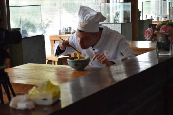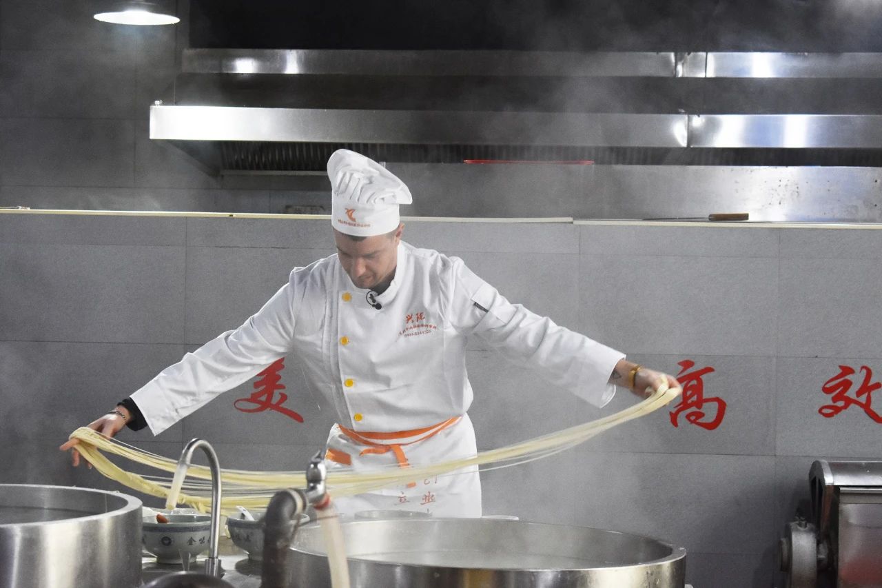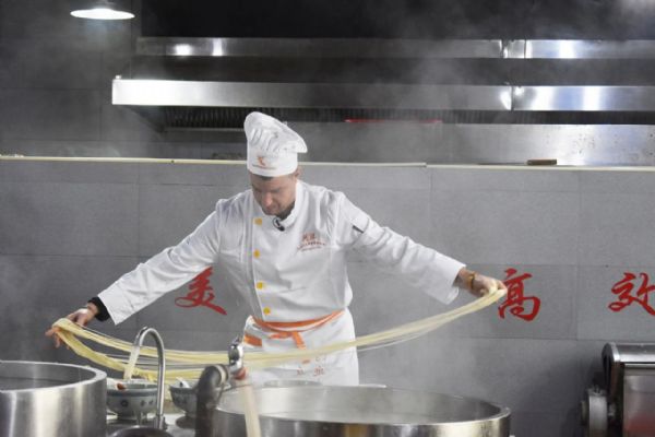 當日上午,司徒建國和團隊首先來到金味德旗下的甘肅興隴蘭州牛肉拉面職業培訓學校。他穿上廚師服,戴上廚師帽,走進培訓室學拉面。學校的周老師一邊給他講解拉面技術,一邊進行拉面展示。司徒建國認真地看著,英俊的臉上充滿了驚奇。只見他細長的胳膊握著溜好的面條,慢慢地向兩端抻拉,面條變長,兩頭對折時,發生“意外”。司徒建國不知道放到左手的什么位置,頓時慌了神。經過周老師不斷的指導,他才勉強完成所有環節,拉好的面顯得“與眾不同”。培訓室里還有其他學員練習拉面,司徒建國和他們互動。趙大爺是“大齡”學員,司徒建國用一口標準的普通話提問趙大爺,“您哪里人?”“您為啥來學拉面?”趙大爺熱情地一一回答。下午,攝制團隊又來到金味德蘭州牛肉拉面體驗工坊拍攝。司徒建國時而品嘗牛肉面,時而講解牛肉面文化,忙得不亦樂乎。而后,他親自下廚做了一碗牛肉面。兩相對比,更體現出金味德牛肉面的專業、精湛、可口。經過不斷的講解、多次的拍攝,司徒建國和他的團隊終于完成了攝制任務。“蘭州牛肉面真好吃,蘭州牛肉面文化博大精深,我會好好宣傳蘭州牛肉面,讓更多人來品嘗,喜歡上蘭州牛肉面。”司徒建國伸著大拇指堅定地說到。