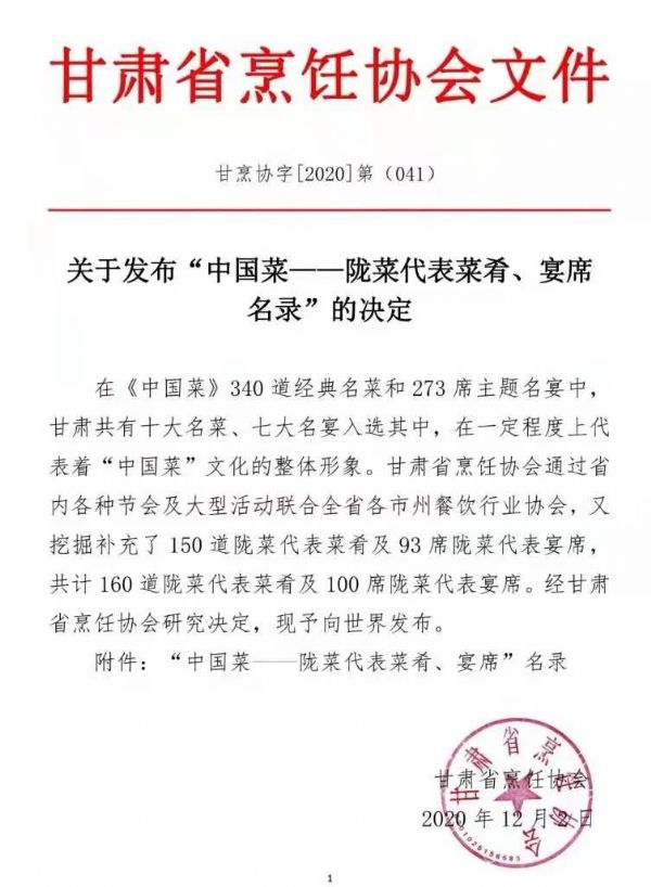 “中國菜——隴菜代表菜肴、宴席”名錄
