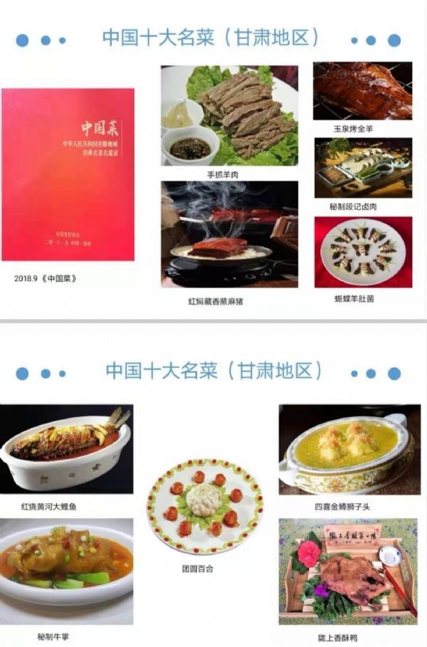 1、蘭州手抓羊肉 2、團圓百合 3、蝴蝶羊肚菌 4、紅燜藏香蕨麻豬 5、秘制段記鹵肉 6、玉泉烤全羊 7、紅燒黃河大鯉魚 8、四喜金鱒獅子頭 9、秘制牛掌 10、隴上香酥鴨 11、大漠醬驢肉 12、鎖陽燒牛尾 13、清泉羊羔肉 14、大串紅柳烤肉 15、古道雞燜餅 16、李家秘制醬肉砂鍋 17、廖香記鹵肉 18、大草灘辣子雞 19、春暉包子 20、胡羊燜餅 21、鴻運當頭 22、絲路炕鍋羊排 23、養生豆湯脆香米 24、石鍋酸菜燜肉 25、隴西驢肉 26、沙窩香芋蒸牛腩 27、全羊湯泡饃 28、高十八鹵雞 29、東灣驢肉 30、蔥爆牛肉 31、極品手撕羊排 32、鳳凰油淋雞 33、鹽焗魚羊鮮 34、酸爛肉 35、一掌定乾坤 36、蝴蝶羊脖 37、隴西特色臘排 38、泉水羊排 39、隴上養生粥 40、普康戈壁灘羊冰煮羊 41、新雅全家福 42、巴西烤串 43、果木木炭烤肉 44、福樂泉烤鴨 45、天水四蒸碗 46、牛氣沖天 47、牦牛肉糊鍋 48、新派煎羊排 49、丹江水庫野生香花魚 50、焦溜里脊片 51、獨一無二羊脖子 52、羊肉炕卷子 53、金牌珊瑚魚 54、干鍋羊肉 55、生態黑豬肉 56、特色什錦暖鍋 57、培根山藥卷 58、秦王烤羊腿 59、網紅甜胚小番茄 60、陳家秘制大骨頭 61、片片香肉夾饃 62、錦繡山藥 63、黃河金湯大鯉魚 64、暖鍋 65、汗蒸全羊 66、吉祥三寶 67、世界奶茶 68、安多牛排 69、藏地沙拉 70、醉仙紅燒大魚頭 71、風聲水起野菌燉黃河大鯉魚 72、魚子醬咸蛋拍牦牛掌 73、金城八大碗 74、河州發菜 75、鐵鍋馕餅羊排 76、西域鹽烤牛肋骨 77、燒三鮮 78、大漠生烤羊腿 79、羊頭麥仁煲 80、土豆燉羊肉 81、蔥香麻麩包子 82、金牌煲仔飯 83、養生菜 84、糖醋黨參 85、枇杷土豆 86、酸菜土豆泥 87、百花鍋貼魚 88、鞏昌古法羊排 89、鹵三拼 90、水上腌魚 91、蟹黃墨魚仔 92、三鮮面筋釀葫蘆 93、隴原四寶羹 94、紅扒肘子 95、隴上蒸肉 96、清汆夾沙 97、紅花猴頭菌 98、蘭州蒸豆腐 99、百合大蝦 100、石板烹豬肚 101、尖椒雞卷 102、上湯蘿卜花 103、功夫龍蝦 104、花椒肥牛 105、銀龍牡丹 106、滋補秋葵 107、尋龍帶魚 108、富貴珍寶 109、太極養生羹 110、翡翠養生蝦仁 111、高原藜麥燴老虎斑 112、蜜汁醬燒排骨 113、錦繡嶺南 114、葡撻配鮮鮑 115、絲綢明珠 116、橙香粉蒸牛肉 117、百花爭艷 118、風味乳鴿 119、金牛至尊 120、泰香甜筒雞 121、神農土豆煎羊排 122、大漠烤牛排 123、西北烤全羊 124、羊肚菌 125、牦牛肉配藏飯 126、金絲蝦球 127、隴原一品駝掌 128、菊花黃河鯉魚 129、椒香旦旦龍蝦球 130、生燜羊排配南瓜 131、荷香水果魚卷 132、脆皮芥蘭 133、鐵鍋羊肉 134、津味傳統野生黃花魚 135、蔥燒海參 136、西部咸肉 137、海馬牛頭皮 138、皇家白菜 139、全家福暖鍋 140、麻花豬尾 141、闔家歡樂 142、春燕魚米 143、芙蓉雞 144、隴上三圓 145、甘肅貢肉 146、河西糧倉 147、橄欖冬瓜 148、百花圣鞭 149、人參果燒豬尾 150、金城蘿卜烙 151、鮑汁豬手 152、甘肅大塊雞 153、甘肅捆子肉 154、黃酒排骨 155、面包番茄餅 156、栗子燒雞塊 157、竹筒白牦牛 158、羊雜鍋仔 159、枸杞銀芽 160、紅湯白靈菇