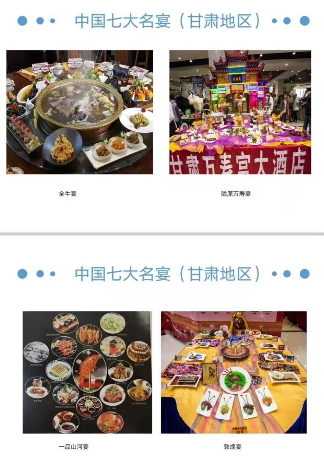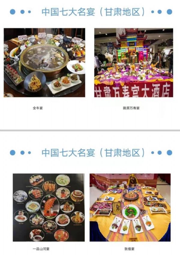 1、黃河宴 2、百合宴 3、全牛宴 4、全羊宴 5、敦煌宴 6、一品山河宴 7、隴原萬壽宴 8、隴薈宴 9、新時代東方宴 10、“盛世華福”宴 11、舍得親民宴 12、金城瓜燈宴 13、最美鄉村宴 14、素齋宴 15、華銳藏地宴 16、青稞宴 17、前程似錦宴 18、一品金豬宴 19、東方清真宴 20、憶隴上宴 21、雪域高原宴 22、將軍宴 23、愛樂萬事興宴 24、廣佳融合宴 25、黃河之濱宴 26、藏家宴 27、蟠桃宴 28、民族風情宴 29、新絲路福樂迎賓宴 30、河西宴 31、中華悅賓宴 32、貴清宴 33、麥爾家宴 34、隴上風情宴 35、隴原金城宴 36、隴西宴 37、錦繡山河宴 38、天水清真菜非遺宴 39、涼州新雅宴 40、隴原風采宴 41、玫瑰宴 42、福壽宴 43、放羊人汗蒸宴 44、貂蟬宴 45、金城八仙宴 46、紅色南梁宴 47、隴菜宴 48、山河錦繡宴 49、方碩養生火鍋宴 50、紅色高臺宴 51、玉門迎賓宴 52、媧皇故里宴 53、籽瓜宴 54、拉卜楞牦牛宴 55、風·雅·頌宴 56、八大碗宴 57、金城老碗九葵十三花風俗宴 58、錦繡甘州 59、融合菜宴 60、玉泉民俗宴 61、七彩丹霞宴 62、銅城家宴 63、銅城鑫盛名宴 64、熱鍋子牦牛宴 65、藜麥宴 66、隴東養生宴 67、龍城老碗宴 68、伏羲女媧養生宴 69、軒轅宴 70、普康戈壁灘羊熱窩子全羊宴 71、福喜壽宴 72、長城宴 73、東方宮一品宴 74、錦繡隴原宴 75、盛世華福宴 76、絲路花雨宴 77、老蘭州年味家宴 78、魅力新區宴 79、七山全羊宴 80、廚王鮑魚宴 81、蘭州十景宴 82、驢肉宴 83、塞上--餃子宴 84、西北一品宴 85、十六技水席宴 86、瑞嶺合家宴 87、隴西宴式——鞏昌十二體宴 88、隴西宴式——藥都御宴 89、土豆宴 90、藥鄉御貢宴 91、石油人家宴 92、東關印象宴 93、敦煌達記醬驢肉全驢宴 94、龍鳳吉祥宴 95、明珠養生豐收宴 96、燒烤宴 97、蘋果宴 98、絲路風情宴 99、舟曲十大件宴 100、絲路合順宴