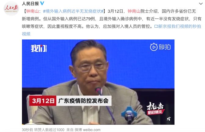 就在今天,鐘南山院士在廣東省疫情防控例行新聞發(fā)布會(huì)再一次強(qiáng)調(diào):國外輸入病例一半沒有發(fā)燒癥狀,只有咳嗽等癥狀,因此重視程度不高。他認(rèn)為,應(yīng)該加強(qiáng)對(duì)入境人員的管控。