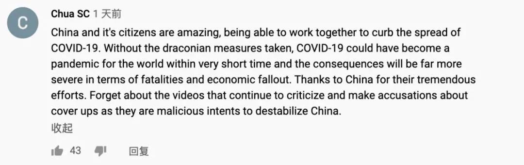 “中國和中國人民真的很棒,能夠團結起來防控疫情。如果不采取嚴厲的措施,新冠肺炎可能在很短的時間內成為世界性流行病,死亡人數和經濟損失會更加嚴重。”網友Chua SC稱贊道。