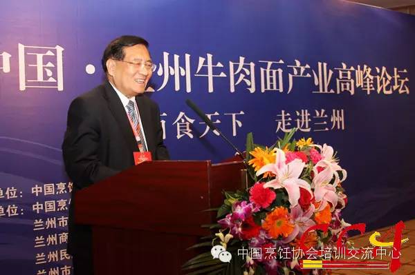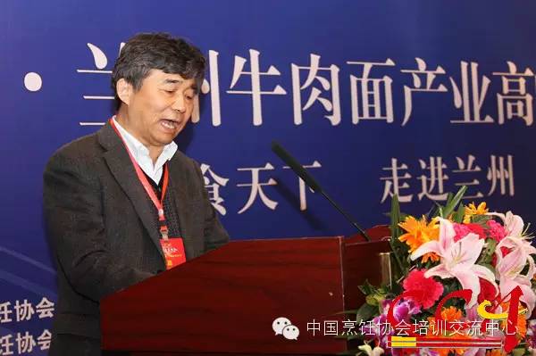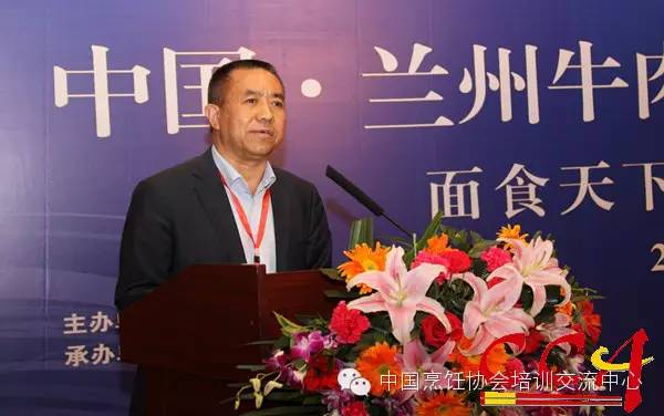 中國烹飪協(xié)會清真專業(yè)委員會主席、蘭州牛肉拉面行業(yè)協(xié)會會長馬利民講話