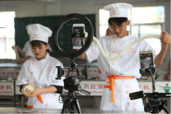 ↑7月10日,在蘭州市興隴蘭州牛肉拉面職業培訓學校,學生們練習拉面技藝,并在網絡平臺上直播。