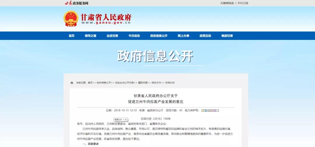2018年10月,甘肅省人民政府辦公廳下發《關于促進蘭州牛肉拉面產業發展的意見》。