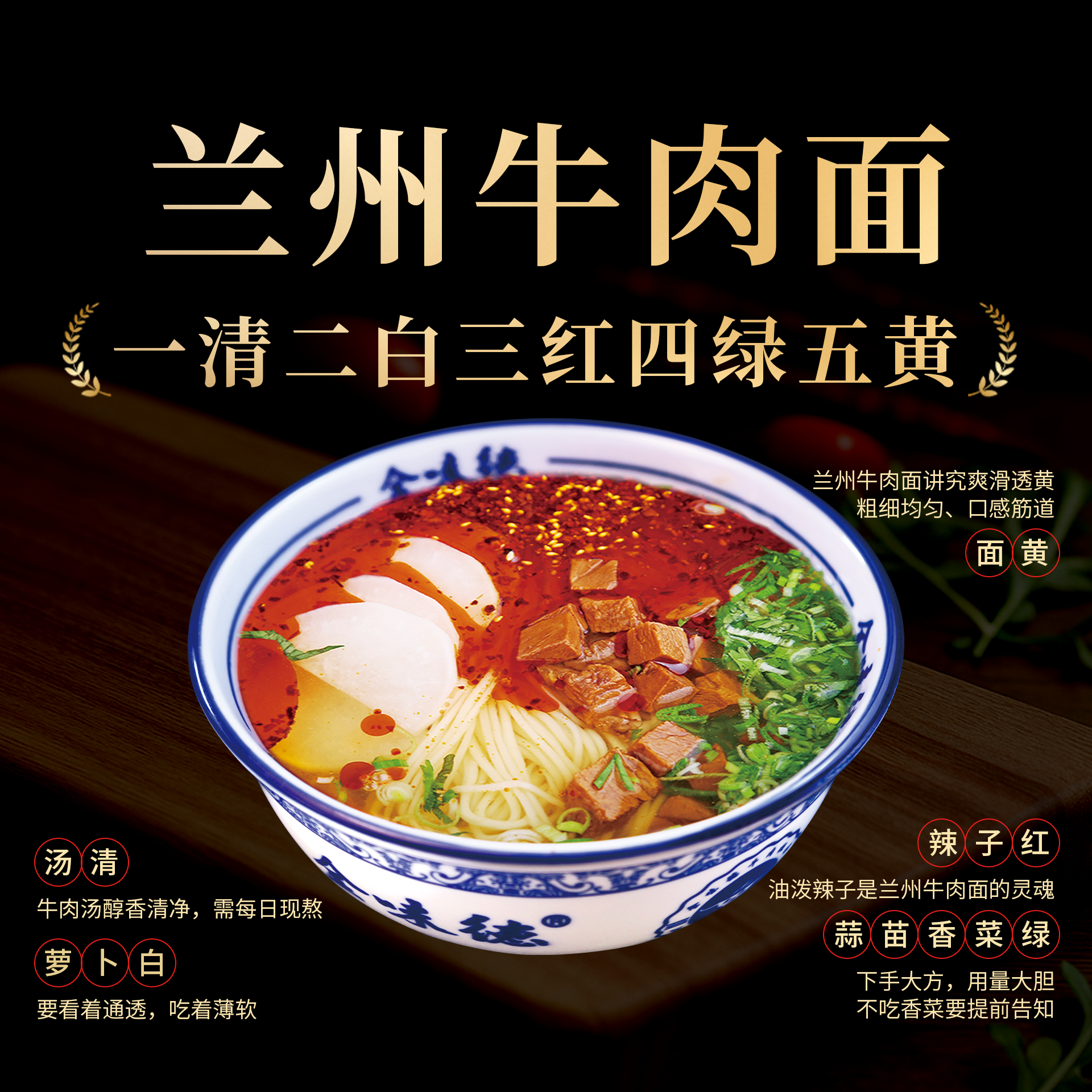 湯底以甘南牦牛骨、土雞及30種香料熬制,鮮味濃郁;辣子采用甘谷辣椒與多香料調配,香而不辣;多種面型(毛細、韭葉、蕎麥棱等)通過幾何結構增強湯料吸附力,豐富口感層次。