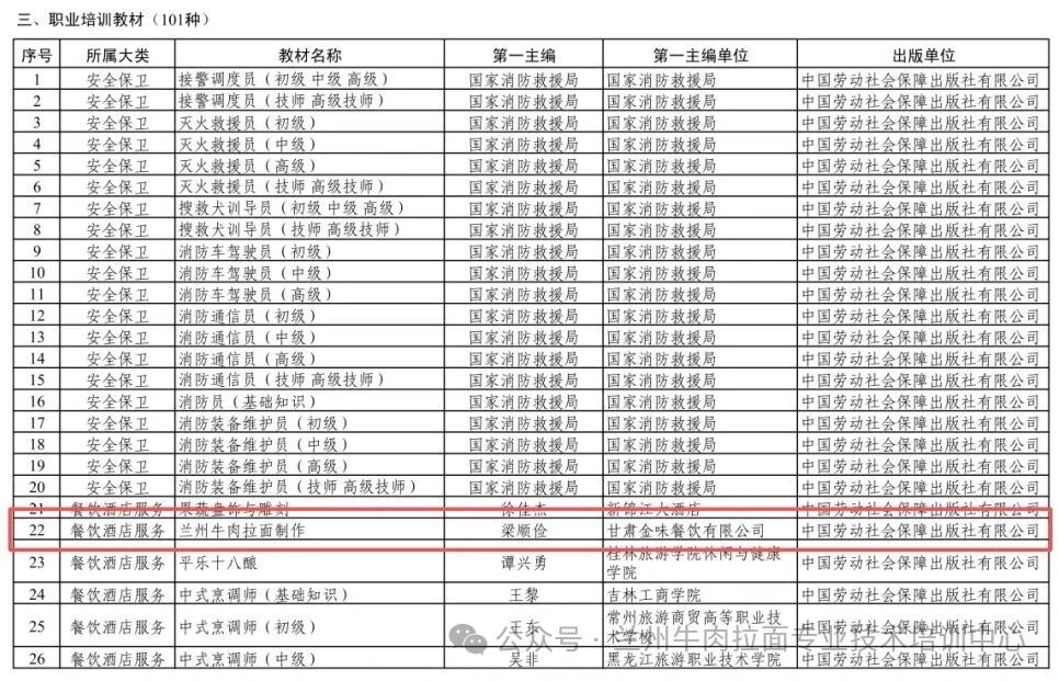 近日,人力資源社會保障部公布第五批技工教育和職業培訓 “十四五” 規劃教材目錄。由甘肅省人力資源和社會保障廳、蘭州市人力資源和社會保障局組織指導,甘肅金味德拉面文化產業集團、甘肅興隴蘭州牛肉拉面職業培訓學校牽頭組建編審團隊,蘭州牛肉面非遺傳承人梁順儉主編,中國勞動社會保障出版社出版的《蘭州牛肉拉面制作》教材成功入選。